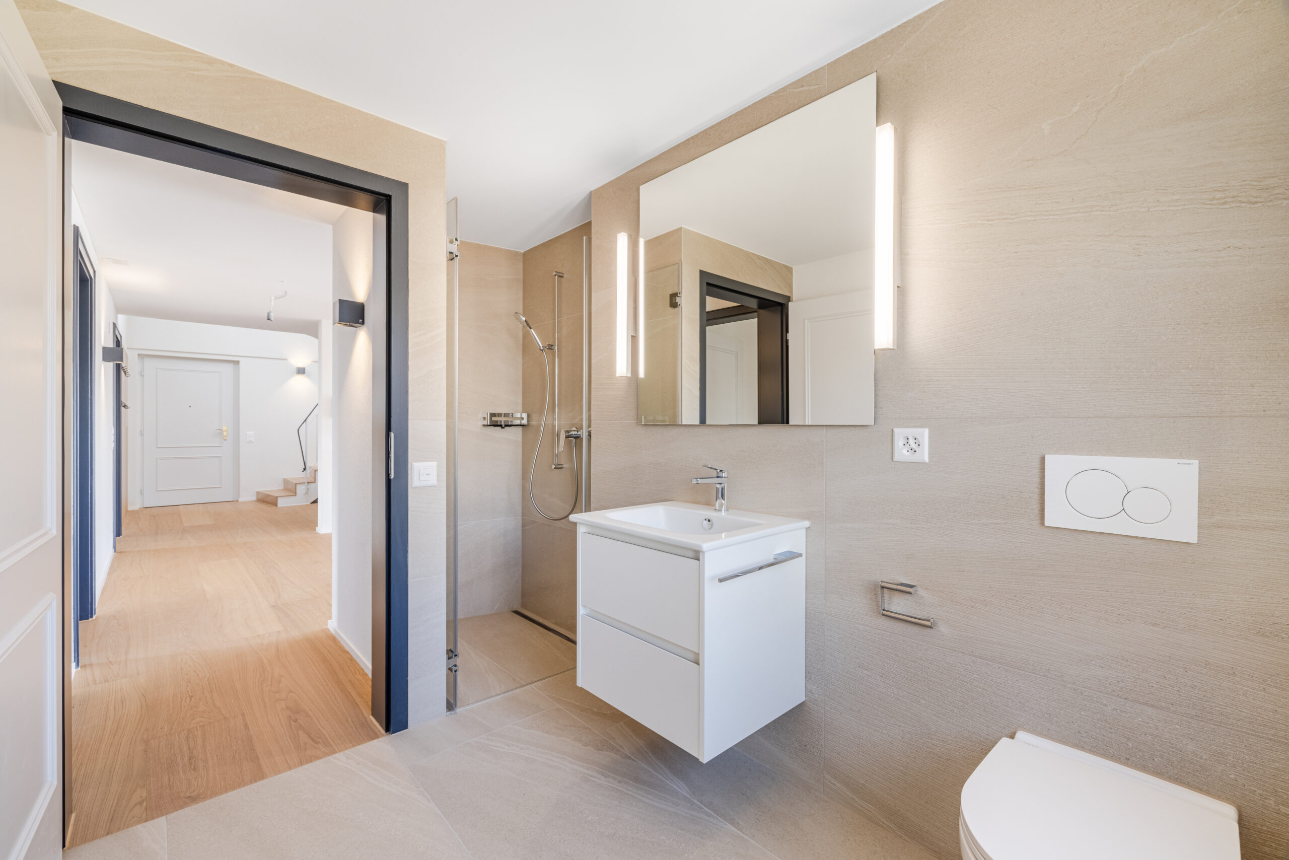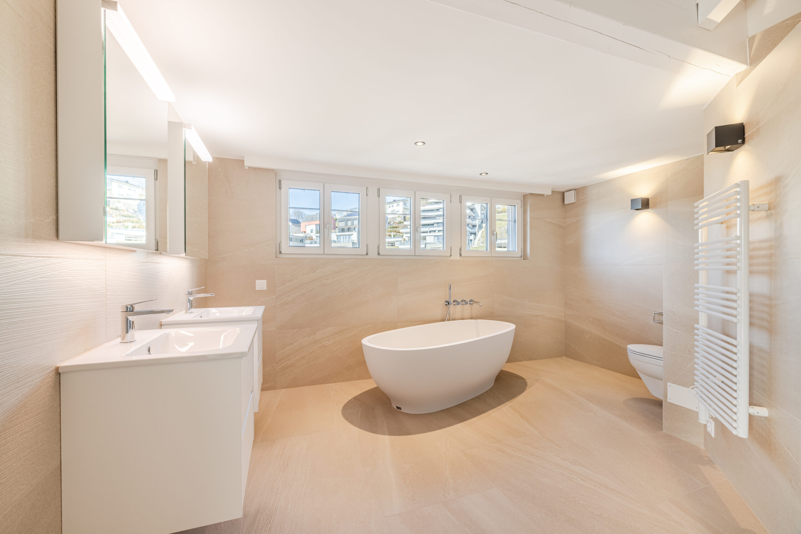 • Badezimmer: Die Nasszellen wurden vollständig neu gestaltet und mit grossformatigen Feinsteinzeugplatten 120x60cm, modernen Armaturen, neuem Lavabo, neuer freistehender Badewanne und begehbarer Dusche mit Duschtrennglas sowie einem Handtuchradioator ausgestattet.