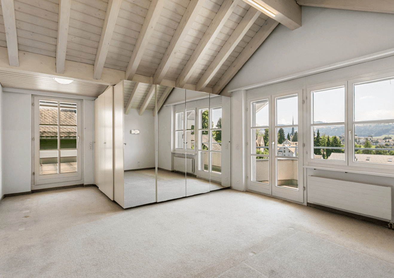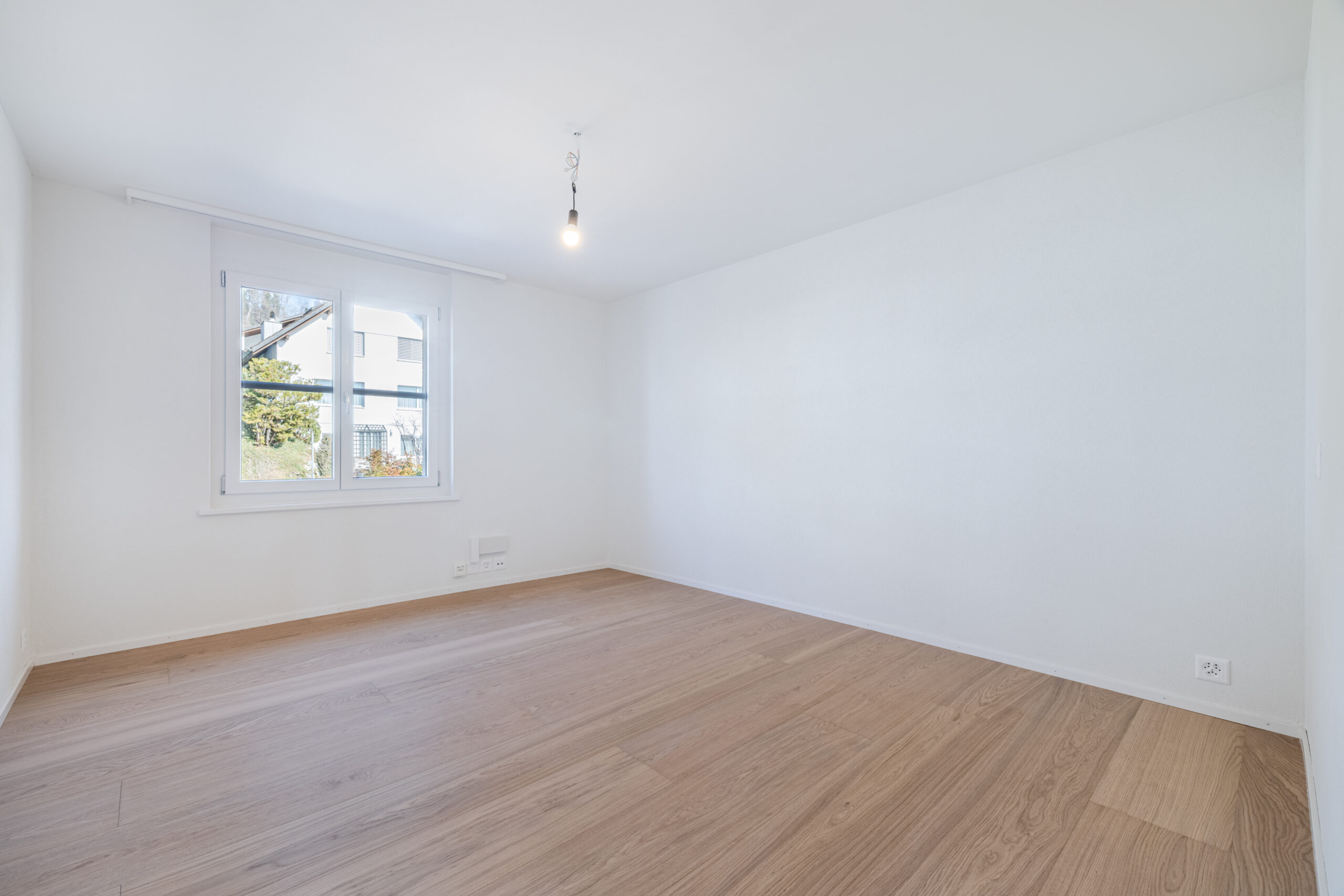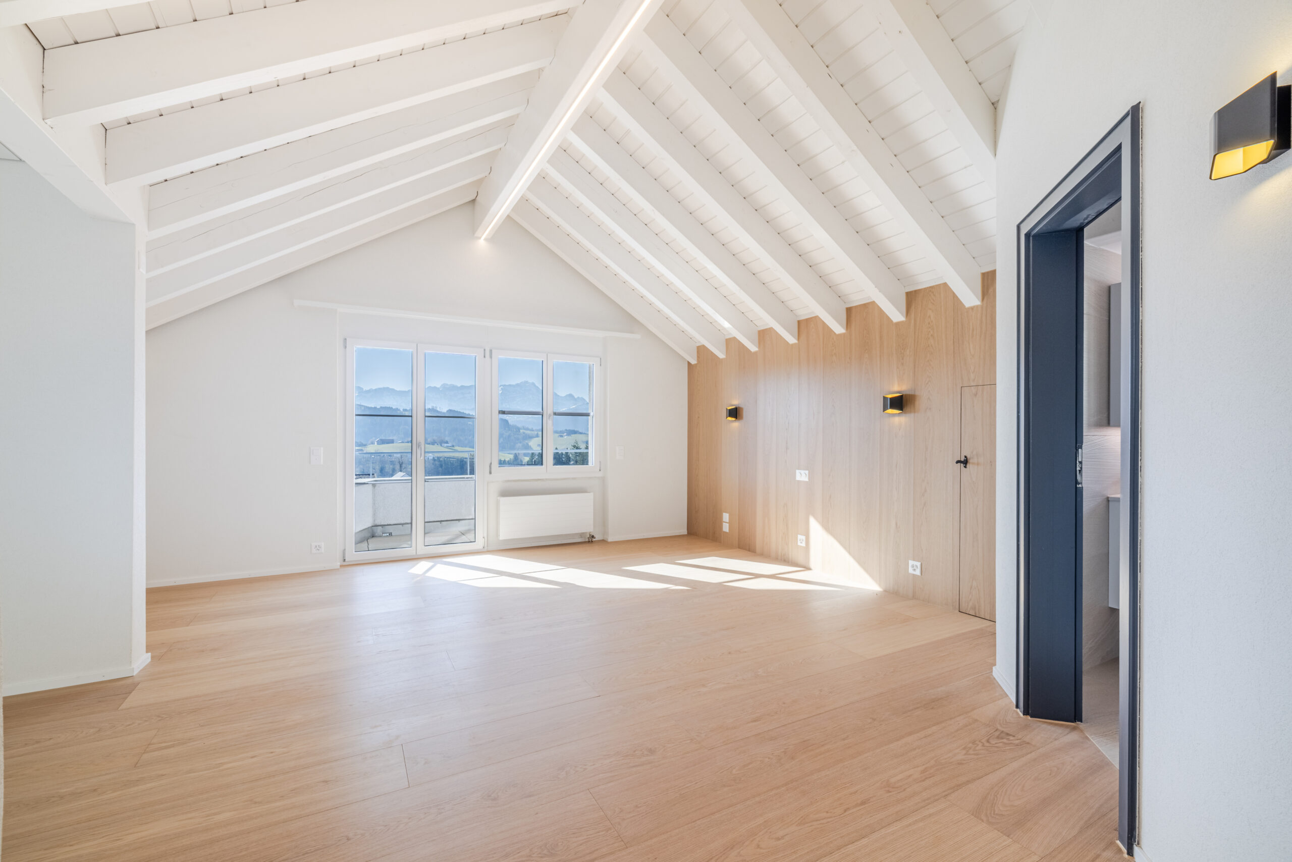 • Wohn- und Schlafbereiche: Edler grossformatiger Natur-Eiche-Parkett leicht weiss eingefärbt, versiegelt, ohne Äste mit 28.3x220cm Massen verleiht sämtlichen Wohnräumen eine warme, natürliche Atmosphäre und sorgt für ein harmonisches Raumgefühl. Teilweise wurden Wände mit dem gleichen Parkett versehen, um ein besseres Wohngefühl zu schaffen.
