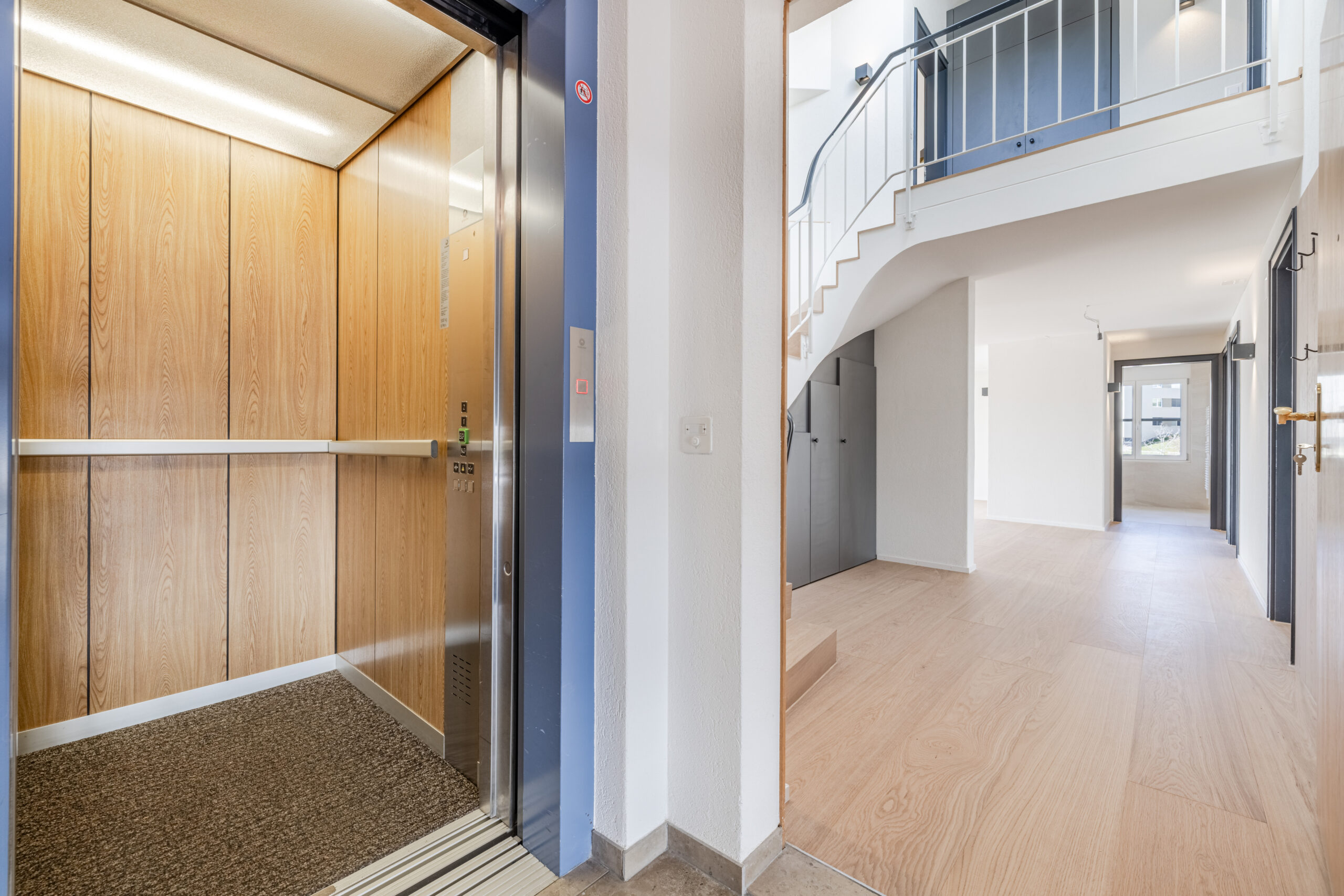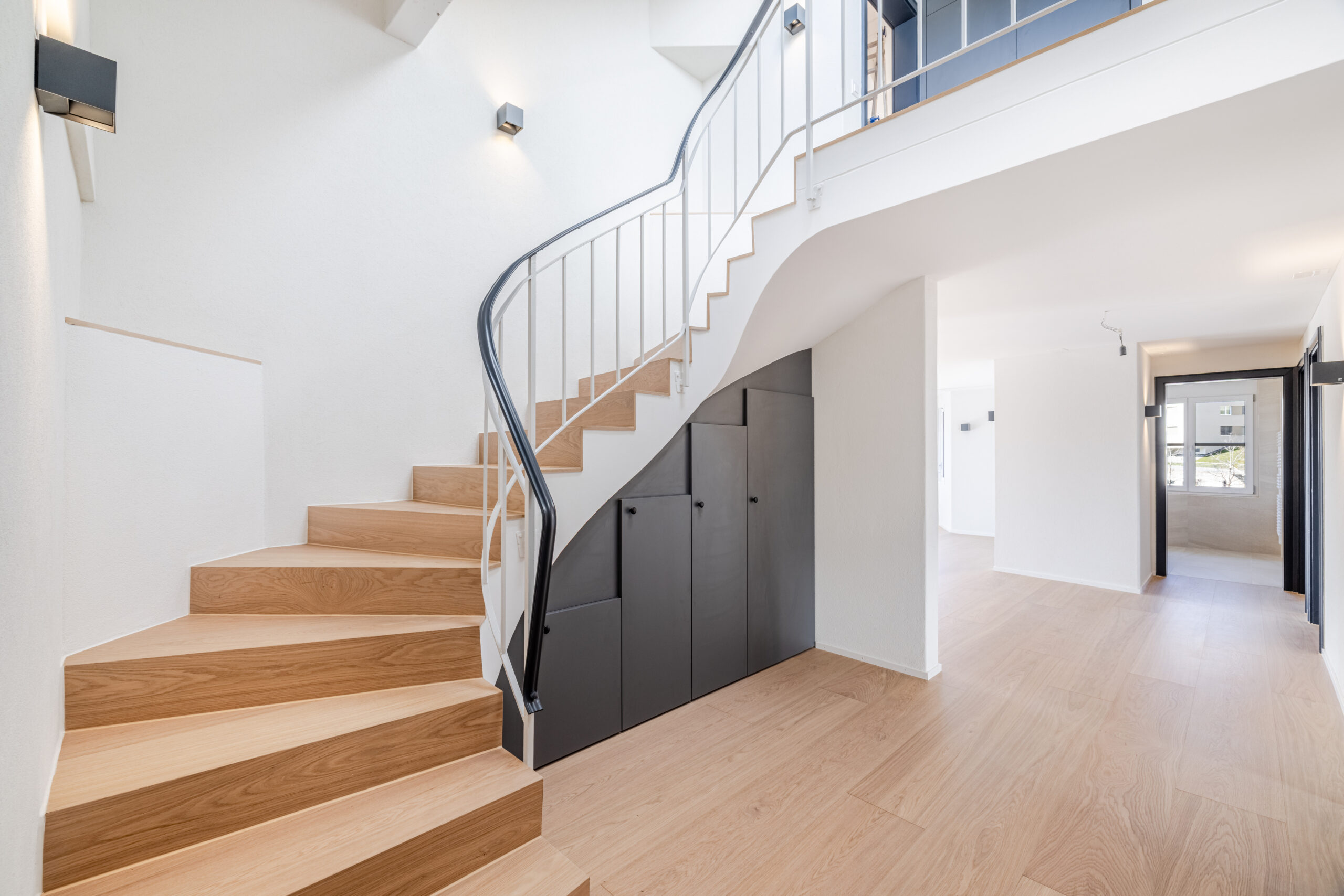 • Oberflächen & Ambiente: Ein ruhiges Farbkonzept mit weissen Wänden, anthrazit Türzargen sowie grauen Türen sorgt für wohnliche Stimmung.