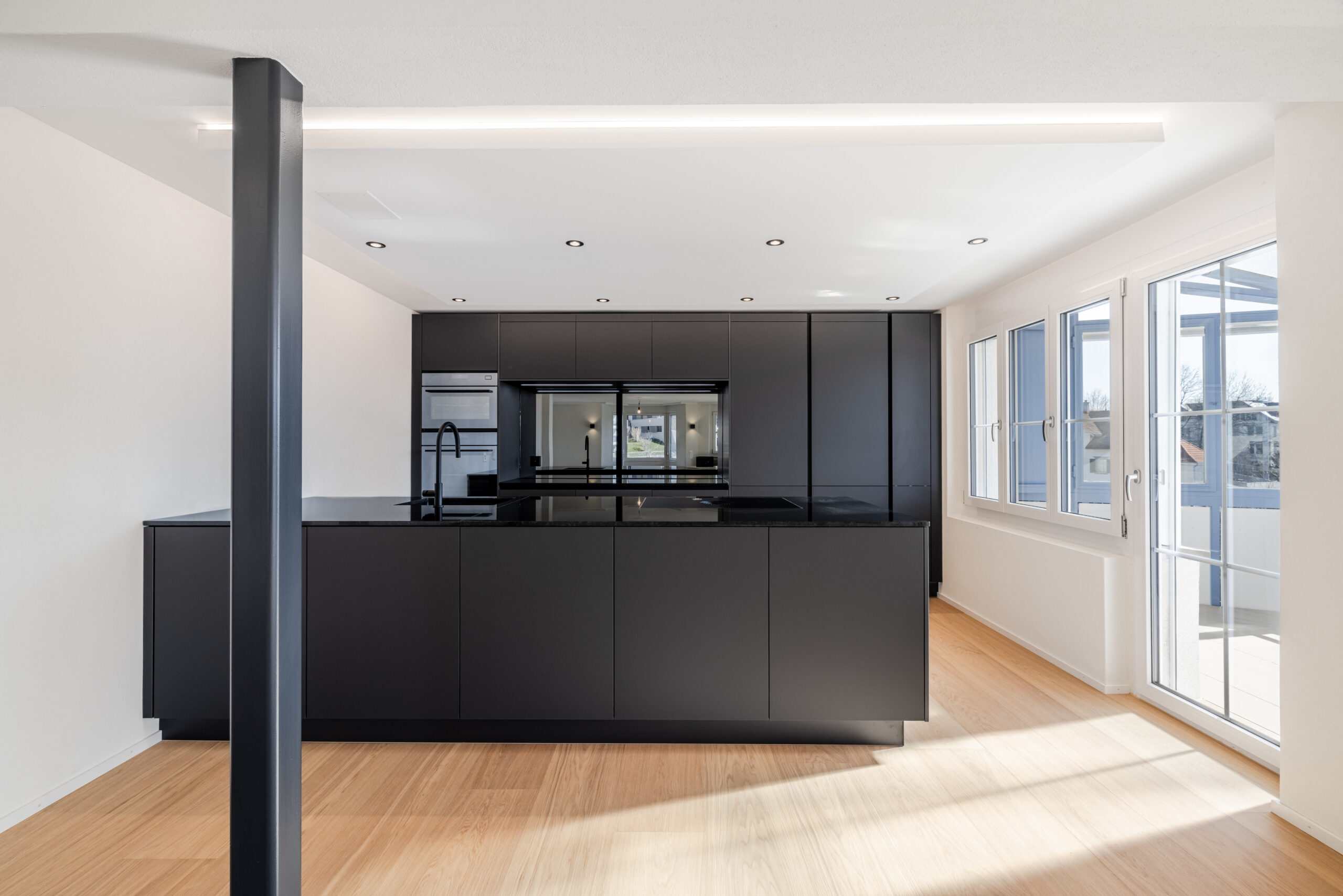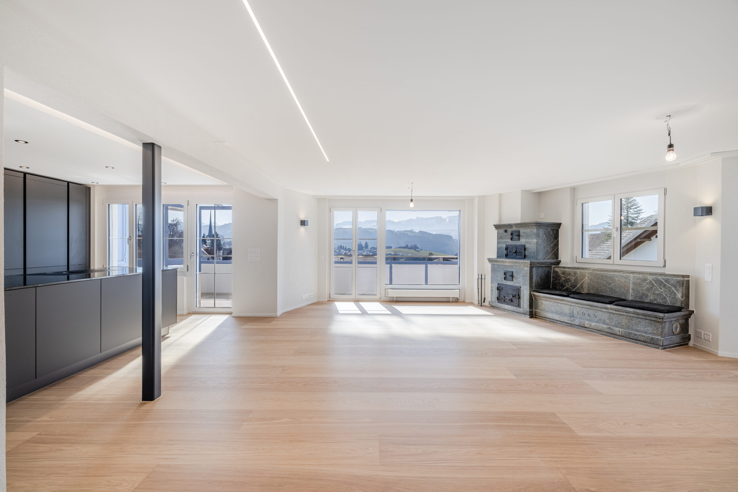 • Küche: In der Küche wurde eine Wand entfernt, wodurch ein offenerer und grosszügiger Wohn- und Kochbereich entstanden ist. Diese Anpassung schafft bessere Sichtachsen und lässt den Raum heller und moderner wirken. Die neu geplante Küche überzeugt mit klarer Linienführung, hochwertigen Geräten von Electrolux wie Kompakt-Steamer, Backofen, Kühl-Gefrierkombination, Geschirrspüler, Bora-Induktionskochfeld (matte Ausführung) und einer robusten Granitsteinabdeckung. Grosszügige Stauraumlösungen schaffen optimale Voraussetzungen für genussvolles Kochen. Die Küchendecke wurde teilweise abgehängt und mit einer rundumlaufenden LED-Beleuchtung ausgestattet. Dadurch entsteht eine gleichmässige indirekte Beleuchtung, die den Raum optisch aufwertet und eine angenehme Stimmung schafft. Die neue Küche überzeugt zudem mit modernen Anti-Fingerprint-Fronten, welche besonders pflegeleicht sind und auch im Alltag eine saubere, elegante Optik bewahren.